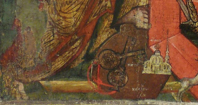 In 1711 there was only one Russian Orthodox church in Reval, St Nicholas’. In the time of the city’s siege in 1710, this church housed the temporary infirmary. As soon as the Russian army took Reval, services were resumed in the church.[23]23. М. Т. Иконников, Православная церковь Святителя…, pp. 66–67; N. Kormashov, The Ioann and Pyotr Iconostasis in St Nicholas Church. – St Nicholas Church in Tallinn, p. 46. No doubt, Peter I visited this church in 1711, and it is very probable that he attended it on the day of his arrival. The tsar’s visit to Reval, and to the St Nicholas Russian church there confirmed symbolically Peter’s possession of the city and the recommencement of the church’s activities. Such an event, of course, was important enough to be commemorated in a specially painted icon. Emblematic details, placed at the bottom of the composition, point to this ‘celebratory’ meaning: a church standing on a cross and a rock, and two keys next to it (fig. 3). These details refer to the Gospel: ‘And I say also unto thee … Peter, and upon this rock I will build my church; and the gates of hell shall not prevail against it. And I will give unto thee the keys of the kingdom of heaven....’ (Mt 16: 18–19.) This verse had become closely associated with all of Peter I’s military achievements after the Azov Campaign in 1696 and had often appeared in ideological statements.[24]24. Е. Погосян, М. Сморжевских, “Я деву в солнце зрю стоящу...”: апокалиптический сюжет и формы исторической рефлексии (1695–1742 гг.). – История и историософия в литературном преломлении. Ред. Р. Лейбов. (Studia Russica Helsingiensia et Tartuensia 8.) Tartu: Tartu Ulikooli Kirjastus, 2002, pp. 9–36. Based on this history of use, the images of the church and the keys, of course, refer to the St Nicholas Church in Reval and the keys of the city (or, probably, of Riga and Reval, two major fortresses conquered in 1710). The Russian state’s coat of arms, a doubleheaded eagle under three crowns, was also a part of this group of triumphal elements on the icon (fig. 4). In his right claw, the eagle holds a scepter and a sword, and in the left an orb. On the eagle’s chest, a heart is placed instead of a traditional shield. In this heart there is a horseman in Roman attire, on a white horse with a spear, defeating a lion, which represents Sweden. The lion is inscribed as ‘a lion’, and the horseman ‘Tsar Peter’. To the left of Peter appear words that refer to the biblical verse: ‘The king’s heart is in the hand of the Lord’ (Pr 21: 1). Therefore, it can be seen that the heart represented in the icon is the heart of the tsar. At the same time, an eagle with a heart on his chest also represents Prince Menshikov’s personal coat of arms. The eagle, therefore, shows that Reval was not only included in one of Russia’s provinces, but also that Menshikov governed it at that time.[25]25. This also points out that Prince Menshikov commissioned the icon. This, however, is only the most common and obvious layer of meaning.